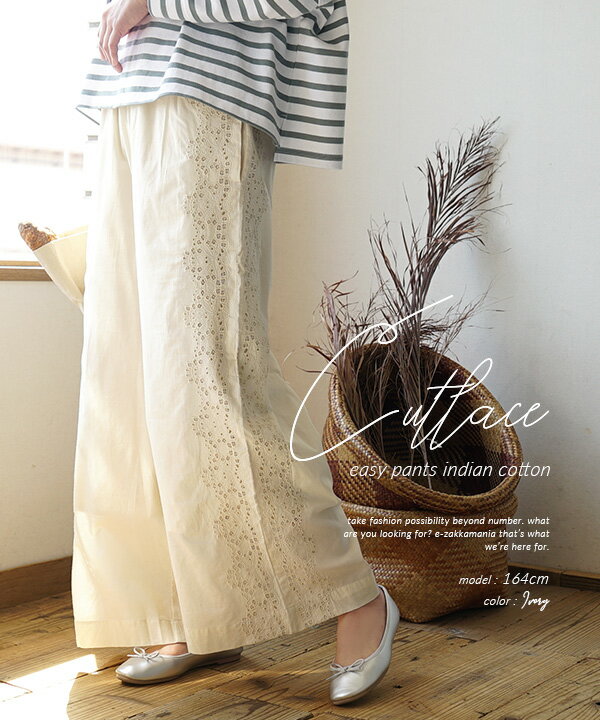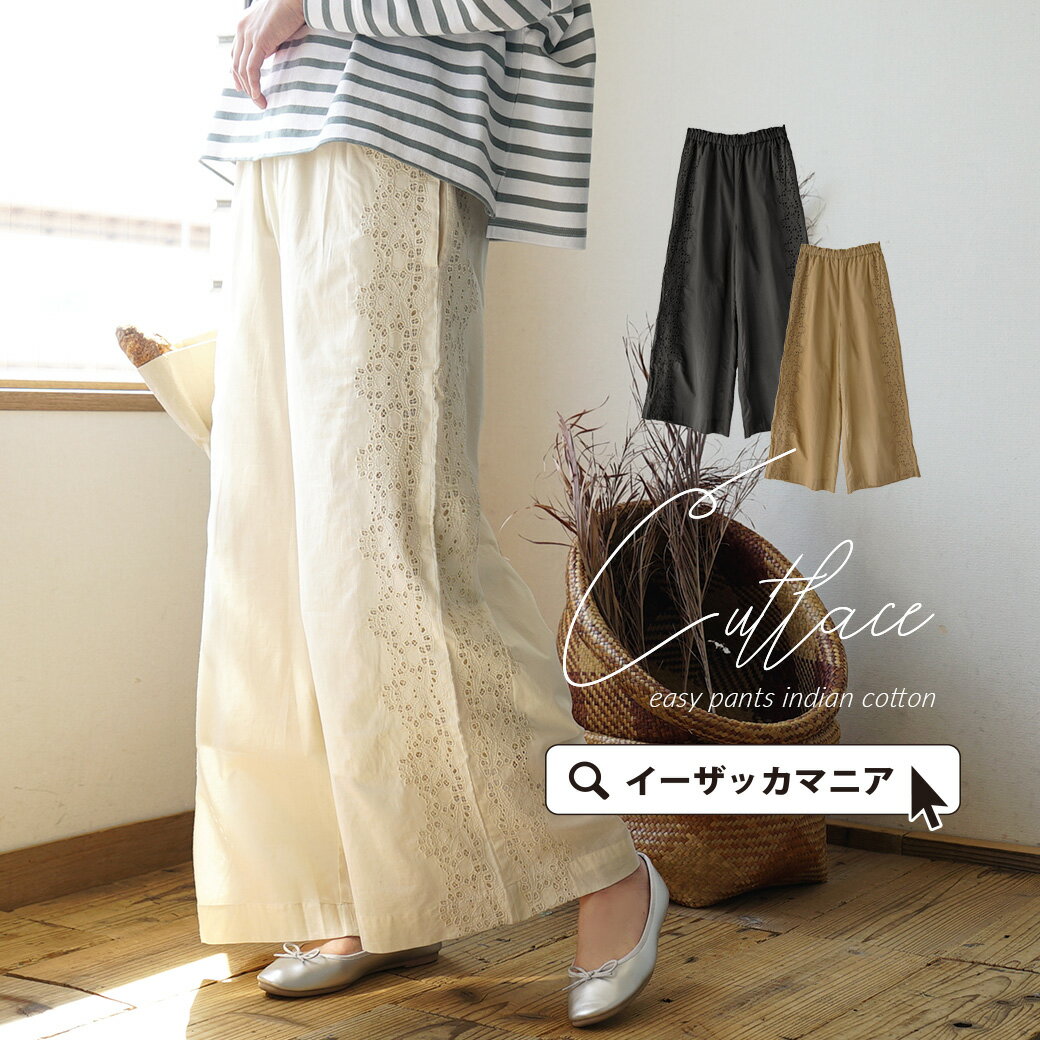 パンツ / 春の装いに似合う、 イージーパンツ 。 レディース ボトムス ズボン ワイドパンツ ワイド ロングパンツ ロング ガウチョ ウエストゴム ウエスト紐 ゆったり 楽ちん 綿100% コットン インドコットン レース ナチュラル ◆インド綿 カットワーク レースイージーパンツ