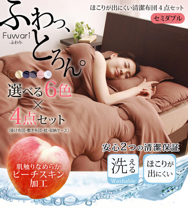 【布団セット セミダブル 寝具セット 布団 洗える ピーチスキン】【ほこりの出にくい掛け布団・敷布団・枕・収納袋の4点】のお得な布団セット。